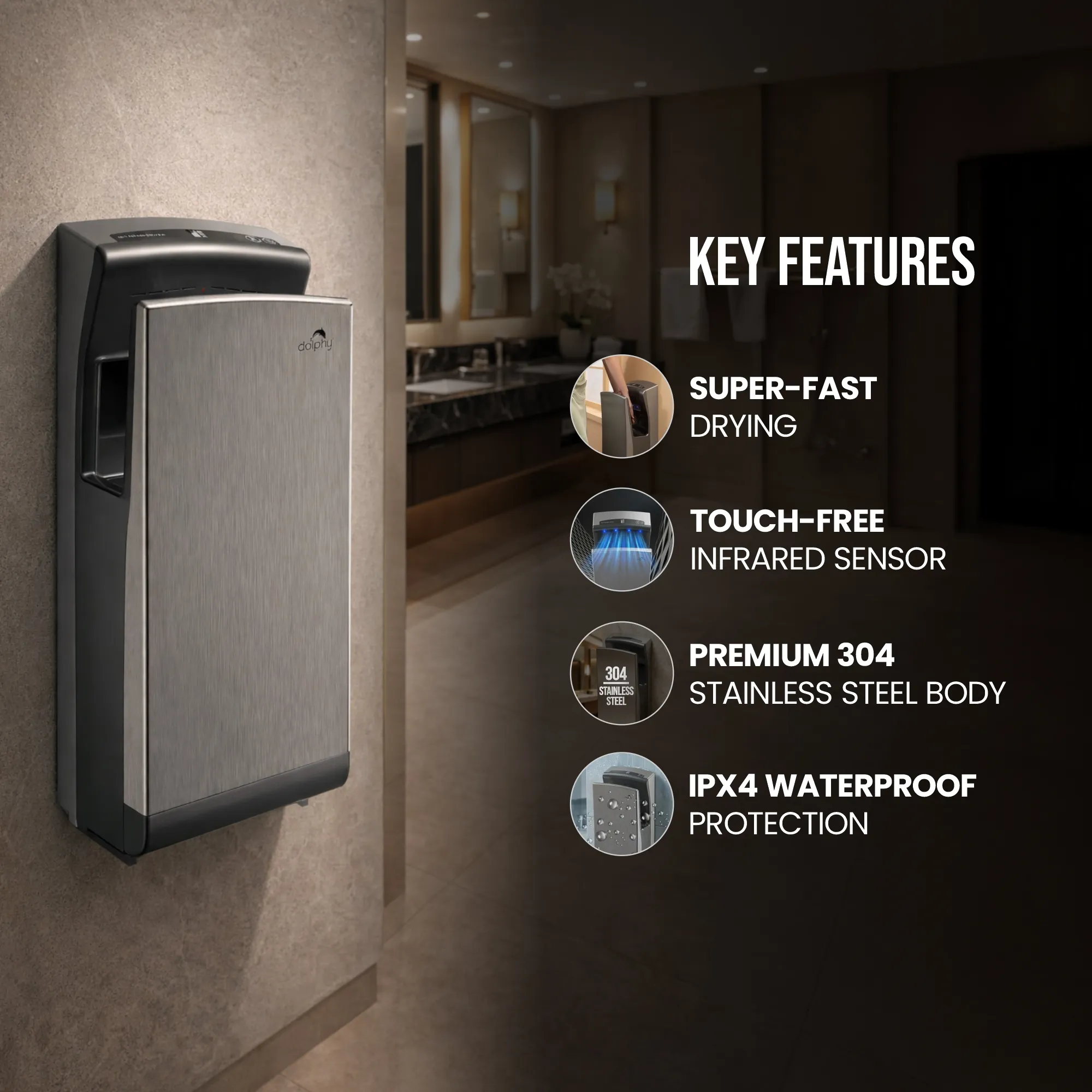 “Dolphy Stainless Steel Jet Hand Dryer (DAHD0043) provides fast, hygienic hand drying in just 7–10 seconds. Made from durable 304 stainless steel with touch-free infrared activation, high-speed airflow, and waterproof design, it’s ideal for hotels, offices, and commercial washrooms.