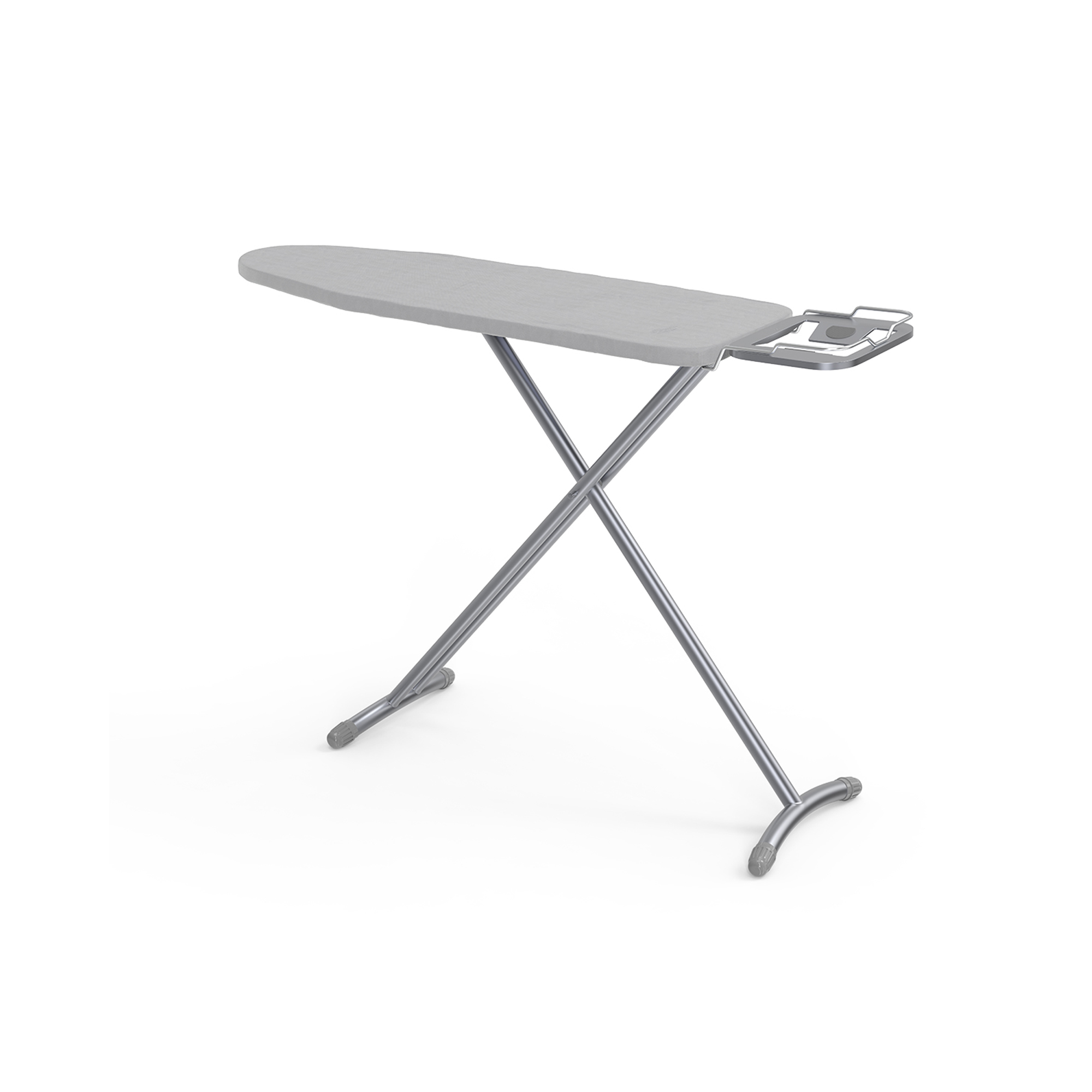 The DIBD0003 is an adjustable, folding ironing board with a metal surface and steel tube stand, finished in gray. It features a cotton cover with a felt underlay for smooth ironing. The board measures 965 x 330 mm when in use and offers 10 height adjustment levels, with a maximum height of 790 mm, providing versatility and comfort. When folded, it compacts to 1240 x 330 mm for easy storage.