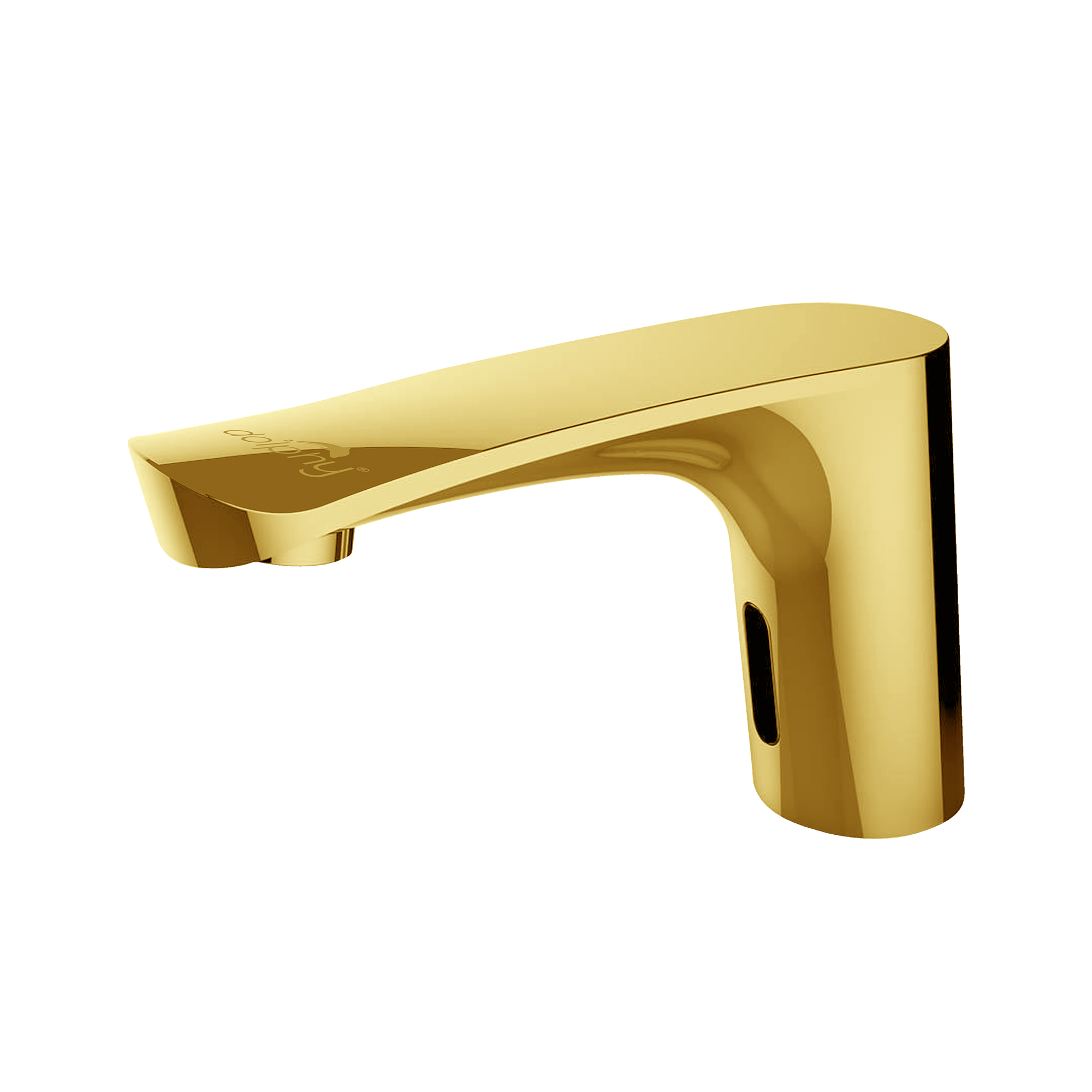 Gold automatic sensor faucet with basin mount and infrared sensor. Offers dual operation (electric & battery) with water output of 1–1.5 L/min for touch-free convenience.
