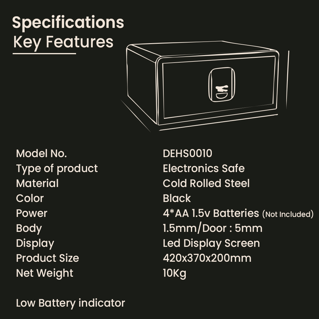 Model DEHS0010 is a black electronic safe made from durable cold-rolled steel with a 1.5mm body and 5mm door. Measuring 420 x 370 x 200mm, it features an LED display screen and operates on 4 AA batteries (not included) for secure and easy access.
