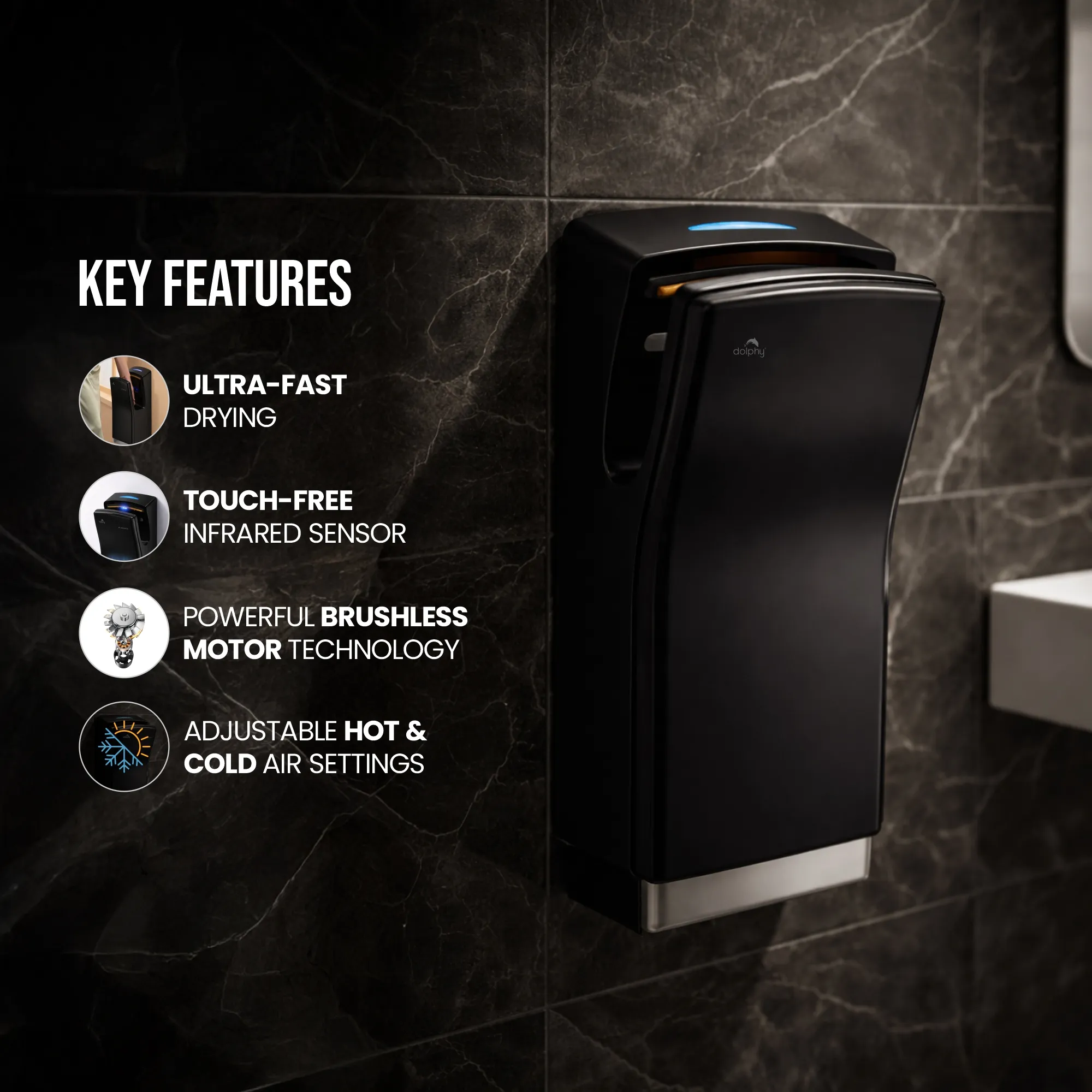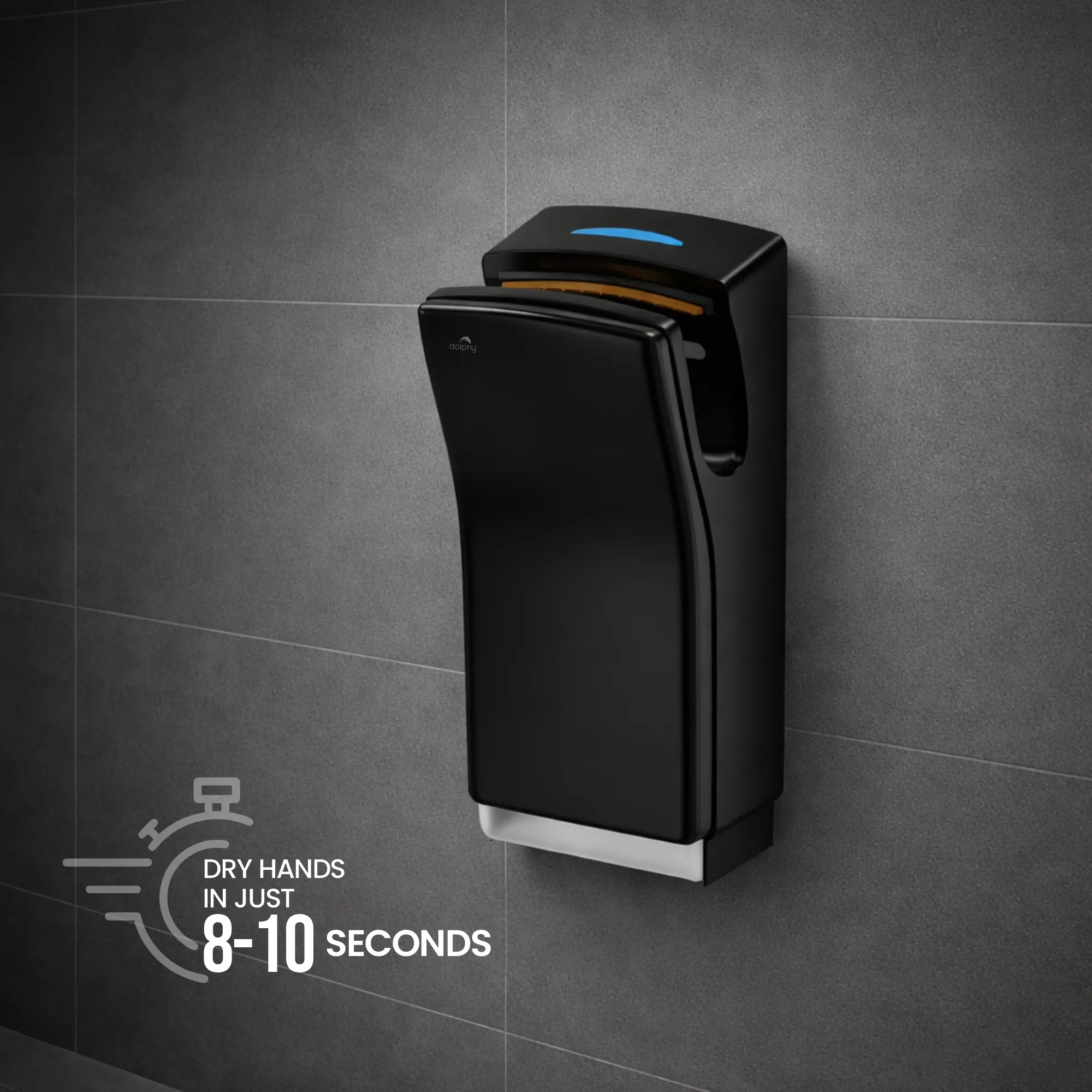 “Dolphy ABS Jet Hand Dryer (DAHD0077) offers fast, hygienic hand drying in 8–10 seconds. Made from high-grade ABS with touch-free infrared activation, brushless motor, adjustable airflow, and IPX1 waterproof design, it’s ideal for hotels, offices, and commercial washrooms.”