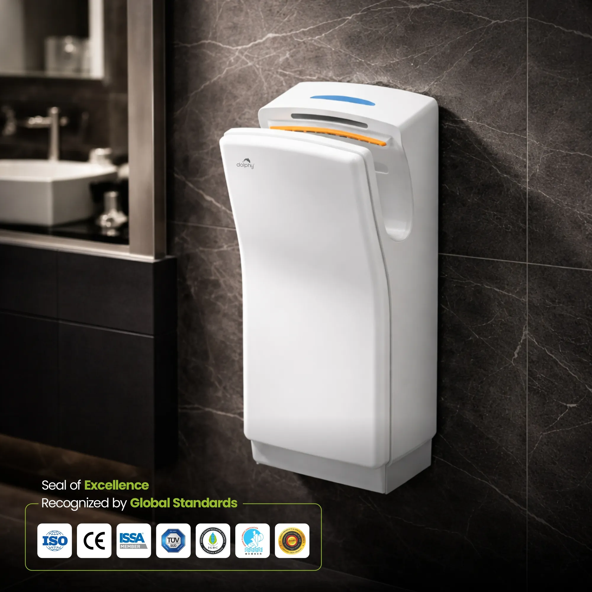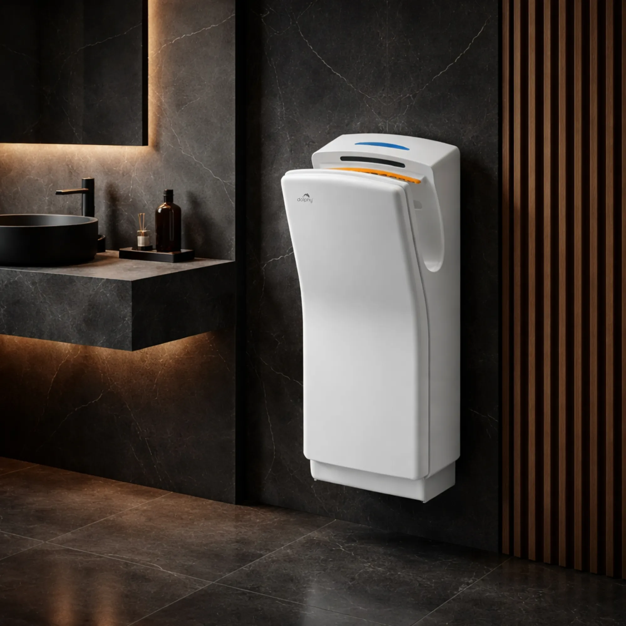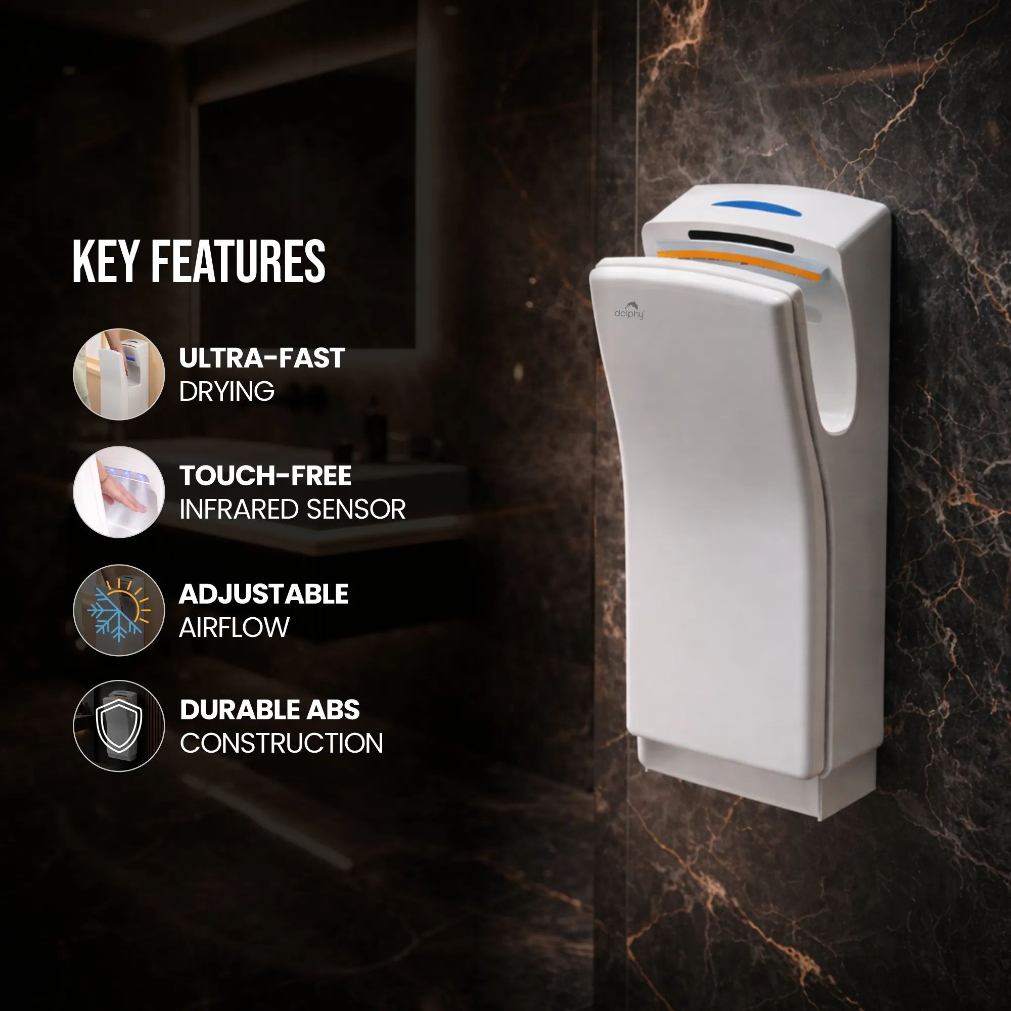 “Dolphy ABS Jet Hand Dryer (DAHD0054) provides fast, hygienic hand drying in 8–10 seconds. Made from high-grade ABS with touch-free infrared activation, brushless motor, adjustable airflow, and IPX1 waterproof rating, it’s ideal for hotels, offices, and commercial washrooms.”
