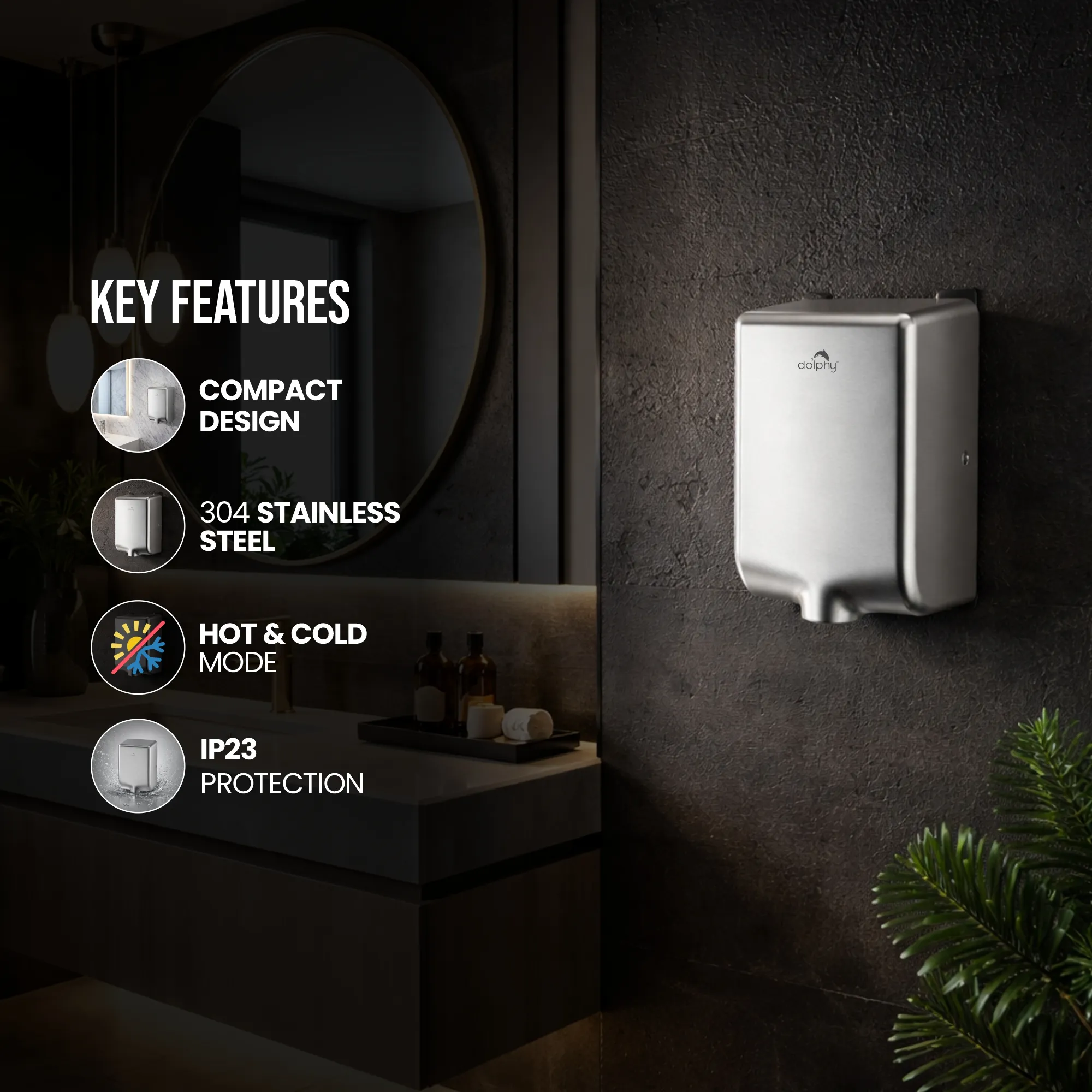 “Dolphy Stainless Steel Compact Hand Dryer (DAHD0049) delivers fast, hygienic hand drying in 12–15 seconds with touch-free infrared activation. Featuring hot & cold airflow, adjustable air and noise control, 95 m/s air speed, and IP23 waterproof rating, it’s perfect for hotels, offices, and commercial washrooms.”