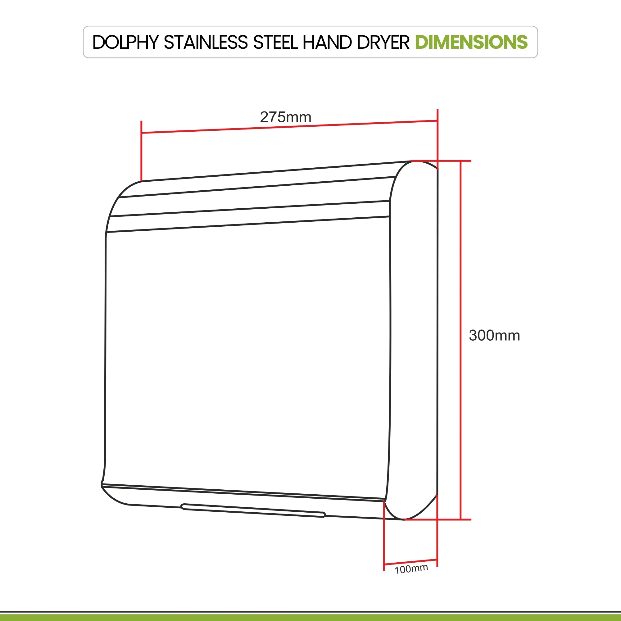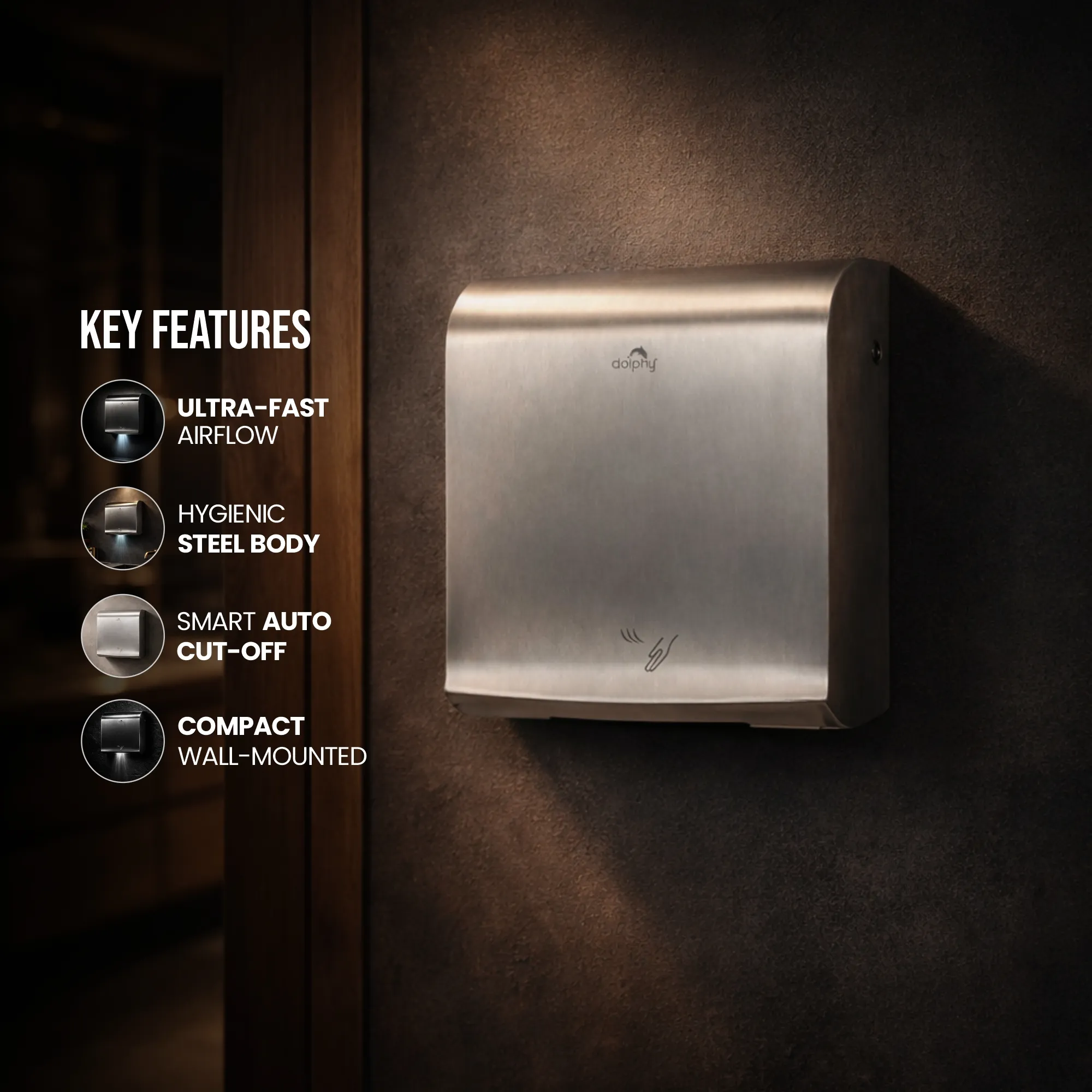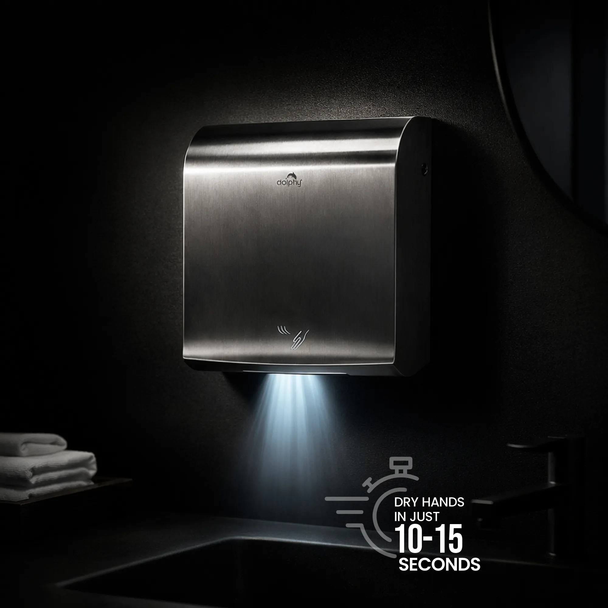 “Dolphy Stainless Steel Hand Dryer (DAHD0078) delivers fast and hygienic hand drying with an airflow speed of 95 m/s. Made from durable 304 stainless steel with auto cut-off at 60 seconds, it’s ideal for hotels, offices, and commercial washrooms. Compact and efficient, it ensures reliable performance in any high-traffic area.”
