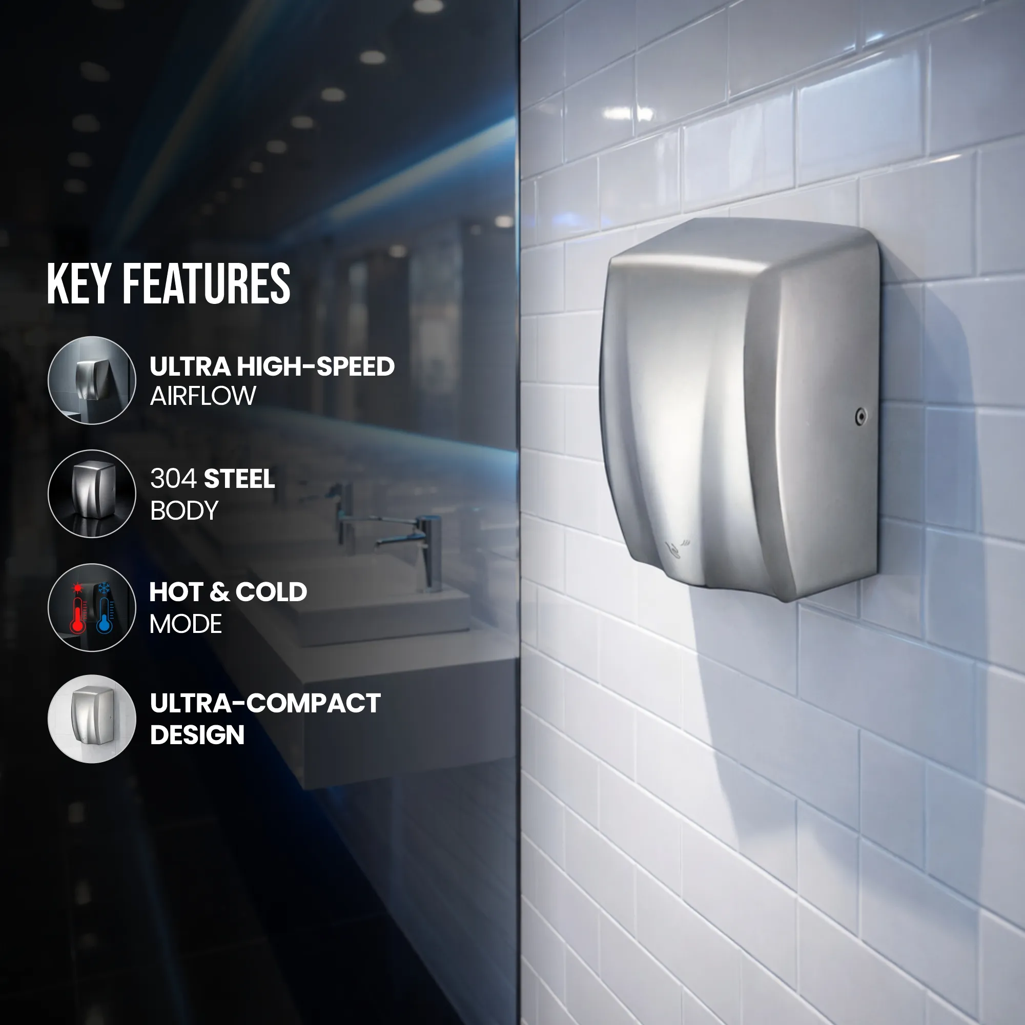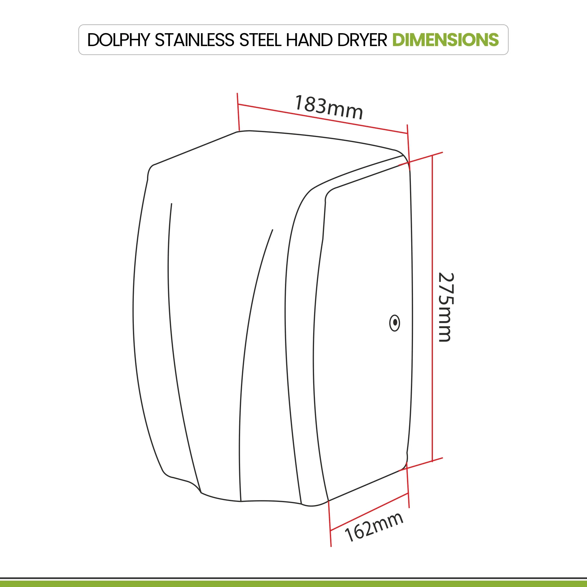 “Dolphy Stainless Steel Compact Hand Dryer (DAHD0080) offers fast, hygienic hand drying with hot & cold airflow and 100 m/s air speed. Equipped with a HEPA filter, brush AC motor, and 60-second auto cut-off, it’s perfect for hotels, offices, and commercial washrooms. Compact yet powerful, it delivers reliable performance in high-traffic areas.”